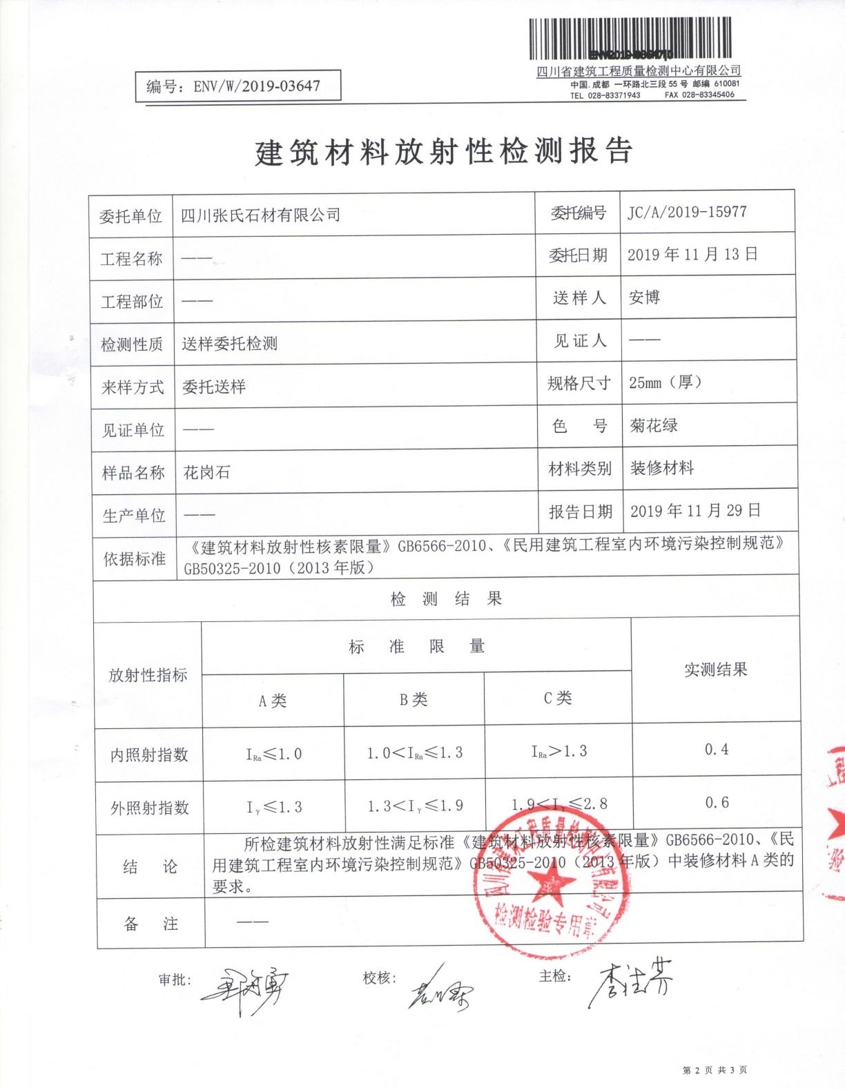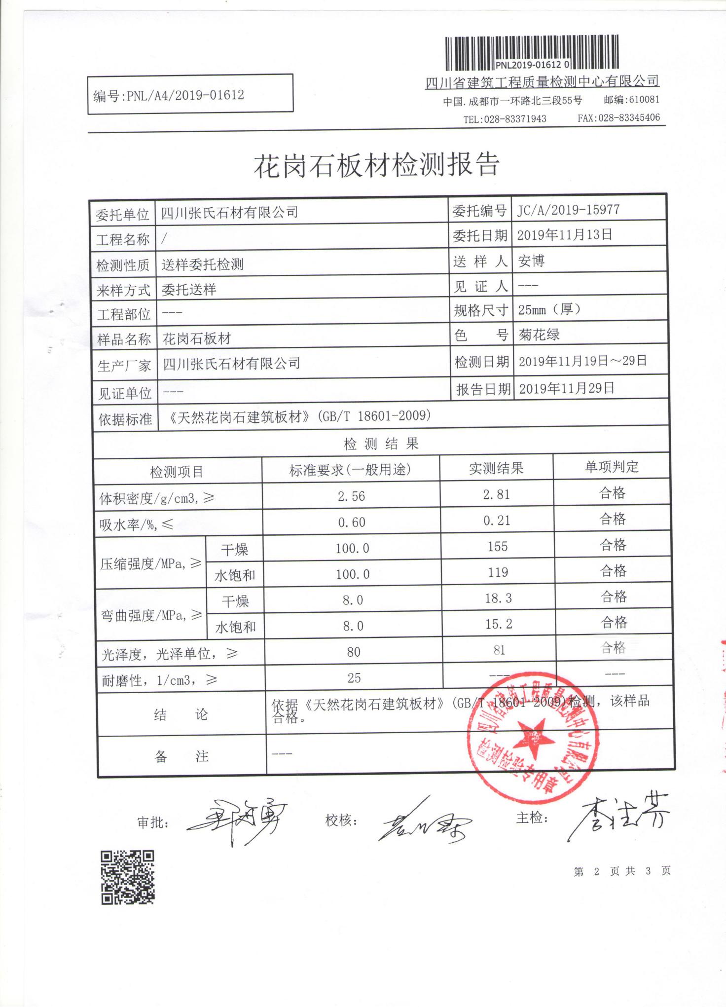 菊花绿硬度好、不风化、耐酸碱,抗折性是普通花岗岩的两倍,表面光度可打磨至95度以上,独具特色的菊花绿皮革面,高度防滑、不受污染、历久弥新,经受日晒雨淋亦不褪色。