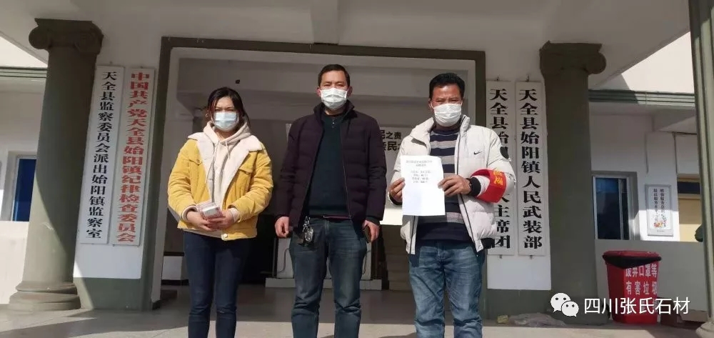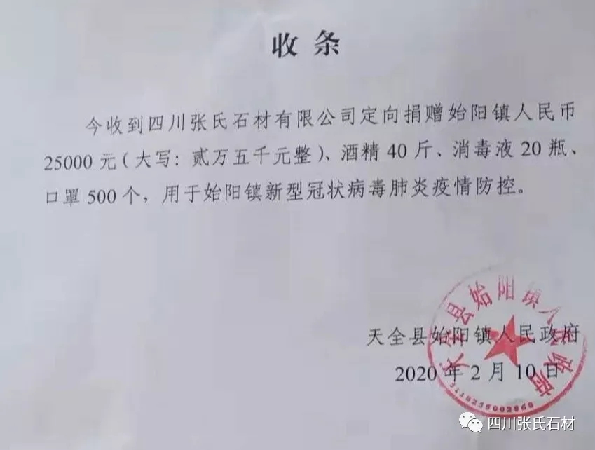 29日,张氏石材公司领导为“抗击新型冠状病毒感染的肺炎疫情”发起募捐行动,倡导张氏石材家人携手开展爱心捐赠,呼吁大家,携起手来,积极捐赠疫情防控急需的物品,并获得大家的积极响应。截止29日晚9点,张氏家人们已自发捐款一万元。公司捐款共计4万元整,并捐赠疫情所需物品:酒精共计80,消毒液40,口罩1000。分发至芦山县飞仙关镇、天全县始阳镇政府,其中芦山县飞仙关镇具体捐赠物资:酒精40斤,消毒液20瓶,口罩500个,现金25000元。天全县始阳镇:酒精40斤,消毒液20瓶,口罩500个,现金25000元。万众一心,众志成城,共同抗击疫情,以实际行动支持疫情防控工作。